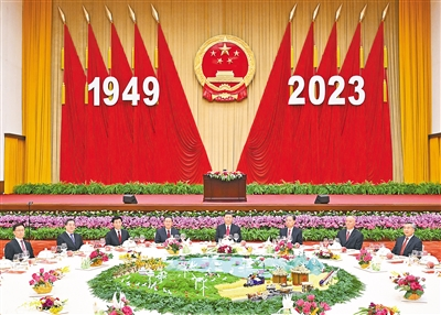 ■新中国成立74年来,我国由一穷二白到全面小康,已踏上以中国式现代化全面推进强国建设、民族复兴的新征程,这是中国共产党团结带领全国各族人民艰苦奋斗取得的巨大成就。今年是贯彻落实党的二十大精神开局之年。我们统筹新冠疫情防控和经济社会发展,统筹发展和安全,积极推动经济持续复苏,有序推进党和国家机构改革,有效应对局部地区洪涝灾害,积极推进对外开放、科技创新、绿色发展,坚定维护国家主权、安全、发展利益,经济总体回升向好,高质量发展扎实推进,粮食生产有望丰收,人民生活继续改善,社会大局保持稳定,我国体育健儿在成都大运会、杭州亚运会上勇创佳绩。这些成绩来之不易、令人振奋
