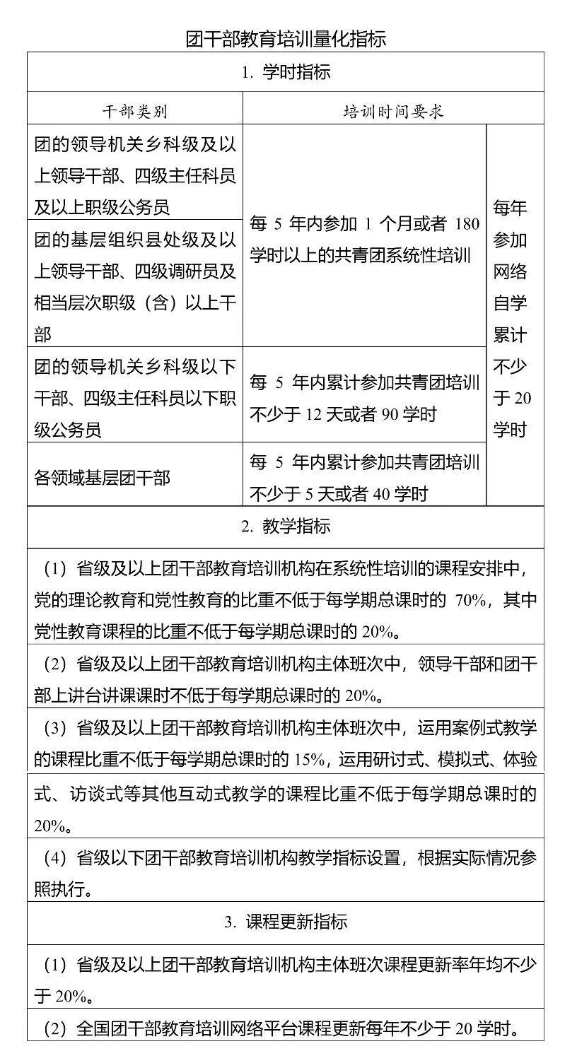 团的基层组织县处级及以上领导干部、四级调研员及相当层次职级(含)以上干部应当每5年内到团干部教育培训机构参加1个月或者180学时以上的共青团系统性培训。各领域基层团干部每5年内累计参加共青团培训不少于5天或者40学时。