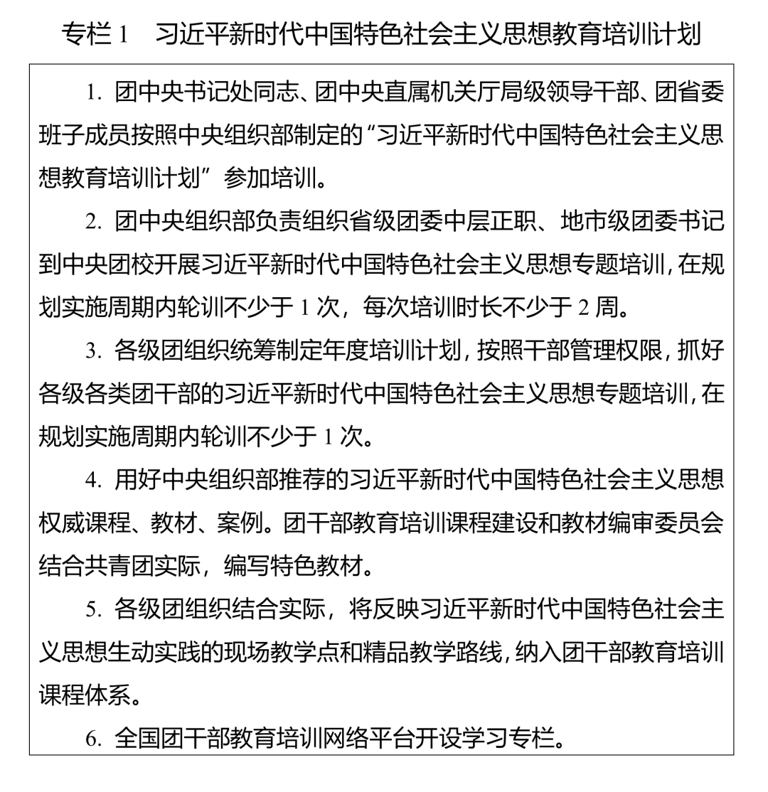 新一轮《规划》坚持把习近平新时代中国特色社会主义思想作为团干部教育培训的根本遵循和主题主线,深入贯彻习近平总书记关于党的建设的重要思想和习近平总书记关于青年工作的重要思想,聚焦提升团干部政治能力、理论素养、群众工作本领,系统谋划未来五年团干部教育培训工作。《规划》共8个部分、设置9个专栏,明确了团干部教育培训的总体要求,对开展习近平新时代中国特色社会主义思想教育培训、加强政治训练和履职能力培训作出专门部署,对团干部教育培训资源建设、网络培训体系建设、教育培训改革创新深化和组织领导等方面作出部署安排。