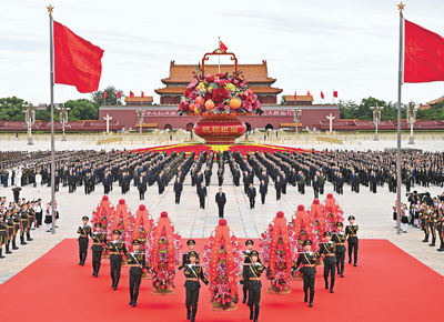纪念碑前,2400多名各界代表手持鲜花,列队肃立。他们中有耄耋之年的老战士、老同志,有胸前佩戴着红飘带的烈士亲属,有国家勋章和国家荣誉称号获得者代表,有受表彰的民族团结进步模范代表,有朝气蓬勃的青年学生和少年儿童。