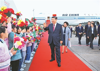 16时许,习近平乘坐的专机徐徐降落在澳门国际机场。习近平和夫人彭丽媛走出舱门,向欢迎人群挥手致意。澳门警察乐队奏响热情洋溢的欢迎曲,舞龙舞狮表演喜气欢腾。舷梯旁,两名少年儿童向习近平和彭丽媛献上鲜花。在澳门特别行政区行政长官贺一诚和夫人郑素贞陪同下,习近平和彭丽媛同前来迎接的人员亲切握手。数百名澳门青少年和各界群众代表挥动国旗、特别行政区区旗和鲜花,表达热烈的欢迎。