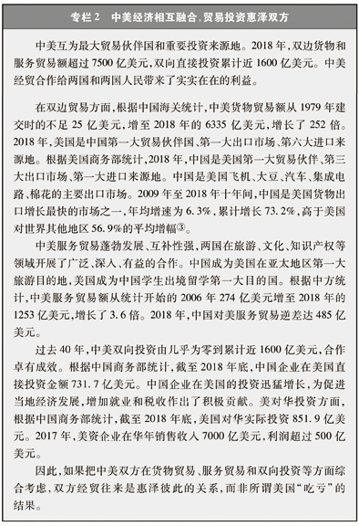 美国无视中美经济结构、发展阶段特点和国际产业分工现实,坚持认为中国采取不公平、不对等的贸易政策,导致美国出现对华贸易逆差,在双边经贸交往中“吃了亏”,并对华采取单边加征关税措施。事实上,在经济全球化时代,中美两国经济高度融合,共同构成完整的产业链,两国经济连骨带筋、互利共赢,把贸易逆差当作“吃亏”是算错了账。美国对中国采取的贸易限制措施不利于中国,也不利于美国,更不利于全球。(专栏2)