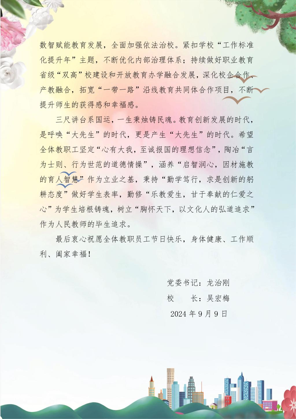 校党委书记、校长在第40个教师节来临之际致全体教职员工的一封信