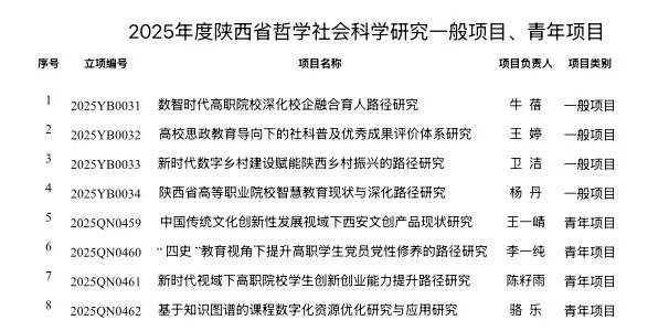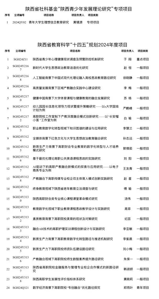 近期,陕西省哲学社会科学工作领导小组办公室、陕西省教育科学规划领导小组办公室、陕西省社科联先后公布了一批科研项目立项结果,我校获批1项陕西省社科基金“陕西青少年发展理论研究”专项项目,24项陕西省教育科学“十四五”规划2024年度项目(其中重点项目1项、一般项目22项、青年项目1项),8项 2025 年度陕西省哲学社会科学研究专项项目(其中一般项目4项、青年项目4项),具体名单见附表。截至目前,我校2024年度共获批校外科研项目62项,其中省级项目19项、厅级项目30项、学会项目13项,首次获批陕西省社科基金专项项目、陕西省教育科学规划课题重点项目。
