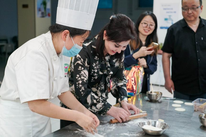 会后,代表团实地考察了学校5G大数据中心、校史馆等教学设施,重点参观了茶艺实训室、西餐综合实训室等实践教学场所,并在紫荆园教工餐厅体验中式面点制作,感受中国饮食文化的独特魅力。