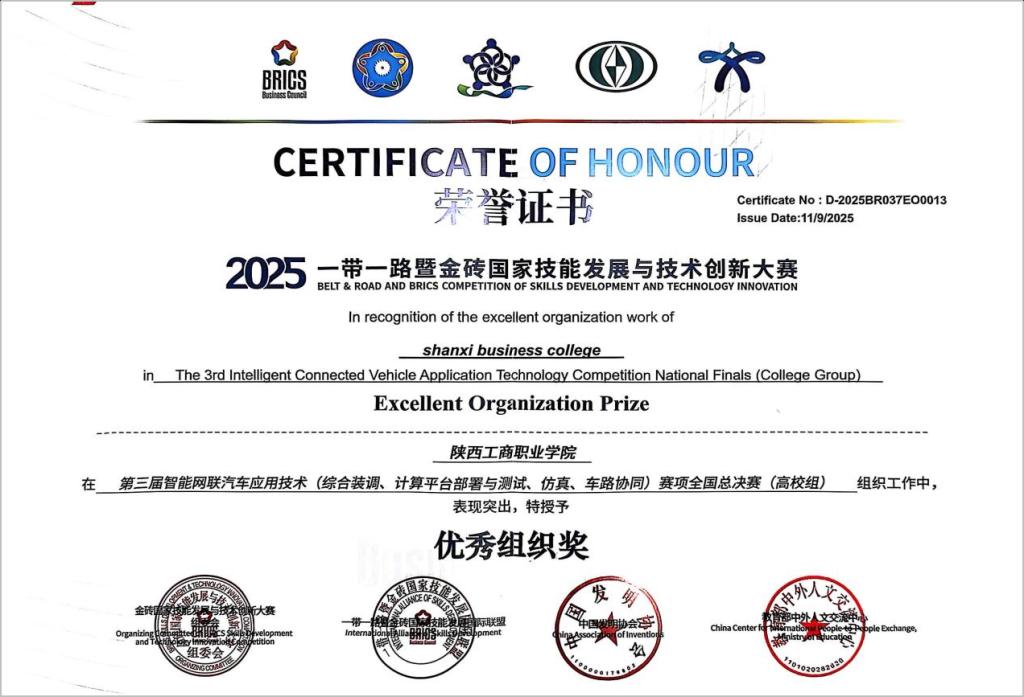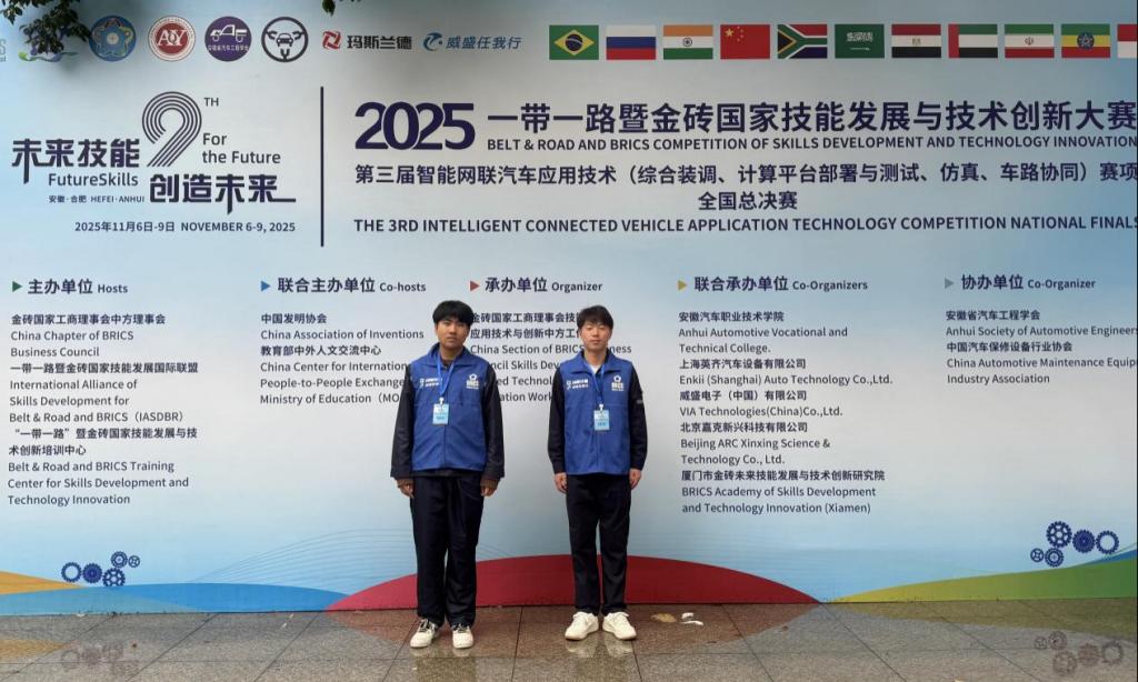 近日,2025“一带一路” 暨金砖国家技能发展与技术创新大赛第三届智能网联汽车应用技术赛项全国总决赛落幕。学校选派周艳峰、李莎为指导教师,24级新能源1班王菊,24级新能源2班彭嘉亮同学组成参赛团队,凭借扎实专业素养与技术实力获得高校组二等奖,学校获“优秀组织奖”。