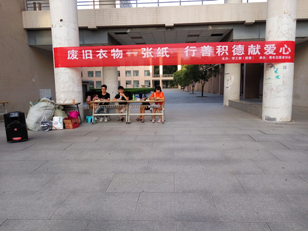 为积极响应团省委、省教育厅、省慈善协会联合组织开展的“一张纸献爱心行动”活动号召,我校青年志愿者协会在校团委指导下在全校学生中联合发起倡议,于7月4日—7日下午在教学楼西口开展了“废旧衣物一张纸,行善积德献爱心”捐物活动。