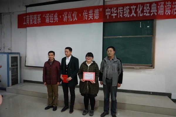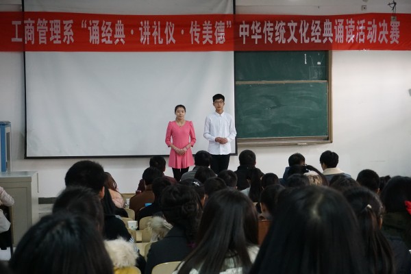 为引导广大青年学生学习和传承中华优秀传统文化,自觉培育和践行社会主义核心价值观,12月25日,工商管理系在阶梯四教室举办了“诵经典·讲礼仪·传美德”中华传统文化经典诵读活动决赛。系主任苗晓锋、副主任付琪、刘广春,全体辅导员、参赛选手和学生代表共170余人参加了活动。