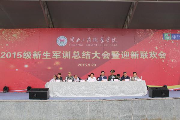 大会第一项举行了军训汇报表演。接下来由军训团团长刘玉峰进行2015年军训工作总结讲话。副校长邓颂东宣读了《陕西工商职业学院关于表彰2015级新生军训先进集体和优秀个人的决定》。大会上对军训中涌现出的7个先进集体和8名优秀教官、5名优秀指导员以及优秀学员代表进行了表彰。最后,校长兰新哲、军训团团长刘玉峰分别代表学校和军训基地互赠了锦旗。
