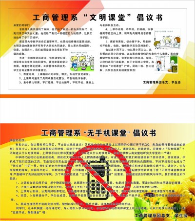 此次活动分为“文明课堂”、“无手机课堂”倡议宣传和主题签名两个阶段。针对当前学生在课堂中存在的不良现象,工商管理系团总支、学生会进行了精心策划,认真撰写了《“文明课堂”倡议书》和《“无手机课堂”倡议书》,呼吁同学们增强遵规守纪意识,积极构建“文明课堂”。中午12时,该系“文明课堂·拒绝手机”主题签名活动分别在教学楼西口和第三餐厅前同时进行,许多师生纷纷驻足,认真阅读倡议书宣传内容,郑重地在横幅上签名,并表示将以实际行动支持宣传教育活动。