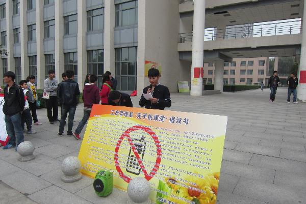 为了积极配合学校改进“三风”创建“大三好”活动,针对大学生的“手机依赖症”,10月28日,工商管理系团总支、学生会在全校学生中发起了“无手机课堂”倡议活动。