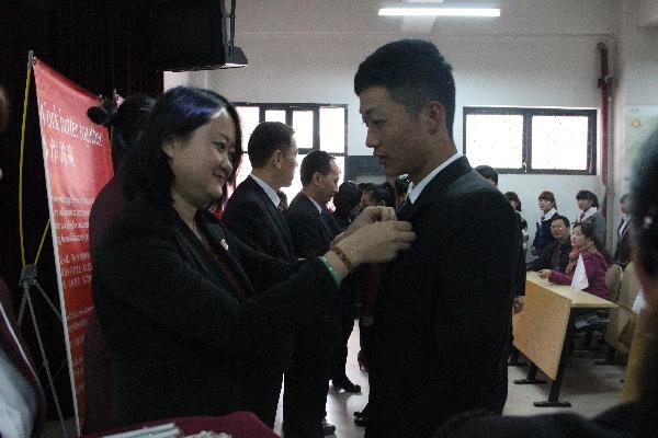 仪式结束后,校企双方的领导共同为洲际英才学院陕西工商职业学院分院2014级全体新生佩戴了洲际英才学院徽章并合影留念。