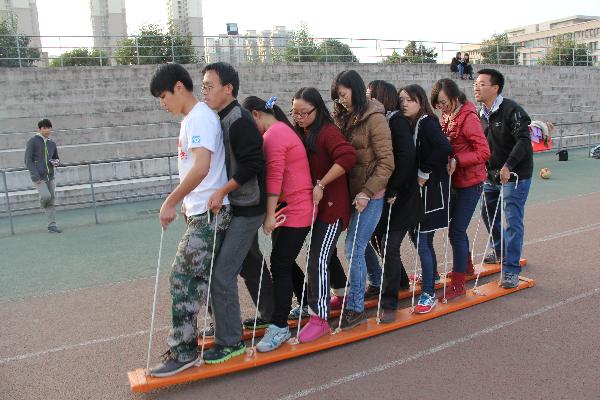 11月11日下午,拓展训练在学校田径运动场进行,青年教师在在教练的带领下,开始进行轻松愉悦的热身游戏,之后分组进行“同心鼓”和“同心同步” 拓展项目的训练,大家齐心协力,努力练习,并举行了分组友谊对抗赛,各组的青年教师发扬团队协作精神,配合默契,共同完成项目,现场不时传来阵阵欢声笑语。