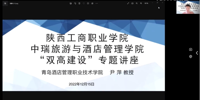 为了进一步统一思想、凝聚共识,为学院集中力量推进“双高计划”注入动力。12月15日,中瑞旅游与酒店管理学院邀请了青岛酒店管理职业技术学院尹萍教授为该院全体教师开展了题为《专业群建设实施路径与做法》“双高建设”专题讲座。讲座由学院副院长张玄主持。
