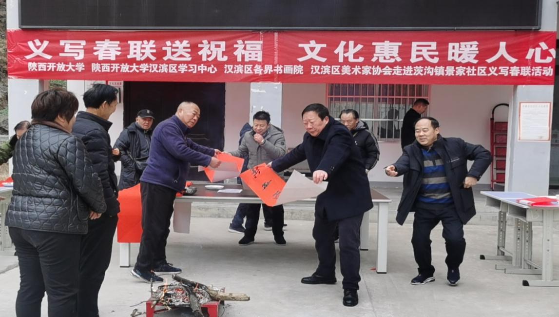 在中华民族传统佳节春节来临之际,陕西开放大学驻安康市汉滨区茨沟镇景家社区乡村振兴帮扶工作队与陕西开放大学汉滨区学习中心、汉滨区书画院、汉滨区美术家协会联合举办“义写春联送祝福 文化惠民暖人心”活动,向景家社区居民义务撰写春联和画年画。活动特邀了在安康地区书画界有较高声誉的名家大家到现场助兴,他们精神抖擞、不畏严寒,挥毫泼墨用情用心为居民撰写春联,用画笔描绘精彩生活图景,表达艺术家对社会文化事业建设的关心和基层群众对美好生活无比热爱的支持。拿到对联和画卷的居民脸上洋溢幸福着笑容,兴高采烈对社区干部说:“以前春联都是在集上去买,很多都是一样的,今年专家给我们专门写对联、画年画,内容还可以自己说,真是太好太方便了。我们现在的生活越来越好、日子越过越红火,离不开习近平总书记对农村的关心,领导共产党为我们农民群众办好事、做实事,我心里想说的感谢的话都写在对联上了”。