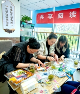活动伊始,老师们围坐在一起,就着清香的绿茶,沉浸在书香的世界。茶香与书香交织在一起,营造出宁静而惬意的氛围。大家拿出了自己喜欢的书籍,分享着书中的精彩片段和阅读心得。通过交流,不仅拓宽了阅读视野,也增进了彼此之间的了解与友谊。分享阅读环节之后,心灵手巧的老师们利用手工材料,发挥创意,制作出了精美别致的书签来表达对阅读的热爱和致敬。