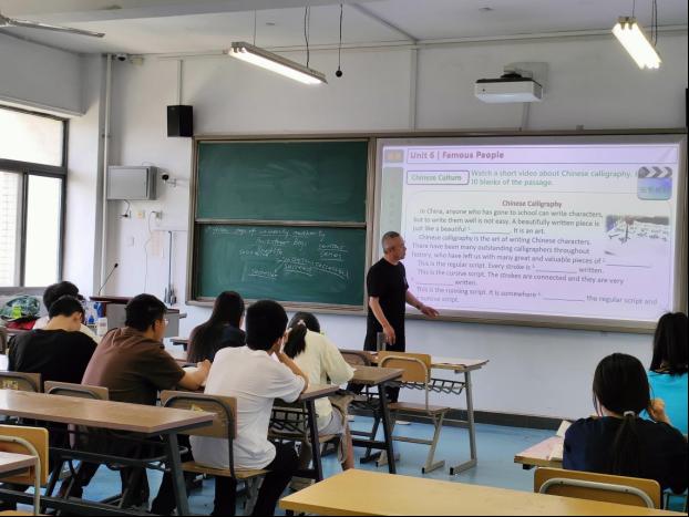 张明老师教授的课为第六单元的Chinese Calligraphy。他从什么是中国书法、为何需要学习中国书法和如何写好中国书法三个方面带领学生深度理解课程内容,培养学生的语言应用能力,拓展对单元大概念的理解,学会用英语传播中国文化。在教学过程中张明老师亲自指导学生们练习书法,改正握笔姿势,教授书法的基础知识等。