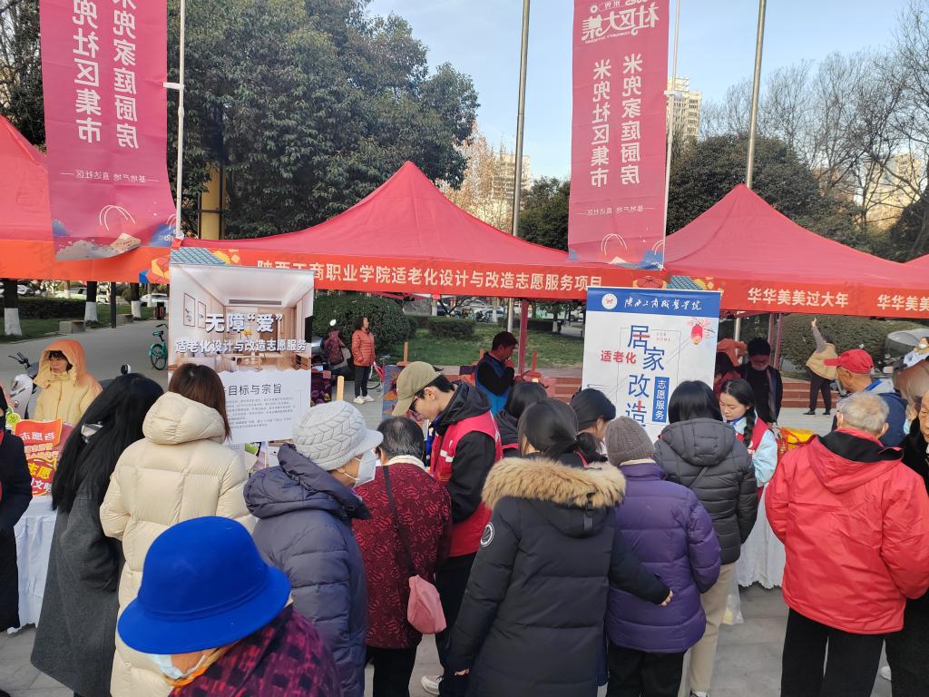 在张家堡街道社区集市启动仪式中,社区集市常态化活动与学院志愿服务相辅相成。志愿者们耐心向辖区居民讲解国家适老化相关政策,展示适老化改造的亮点与好处,为居民幸福生活赋能。他们的暖心服务得到了主办方的一致认可,并接受了省电视台采访。