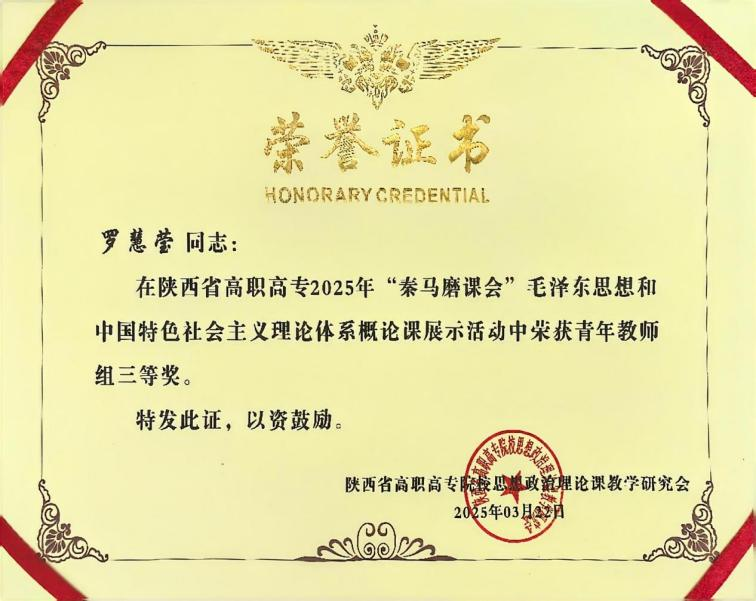 该课程教学展示活动是陕西省高职高专2025年“秦马磨课会”的首场活动,也是“毛泽东思想和中国特色社会主义理论体系概论”课程专场现场展示活动,共有36位教师分别获得“青年组”和“骨干组”磨课活动一、二、三等奖。学校教师黄镜源获“骨干组”二等奖,教师罗慧莹获“青年组”三等奖。