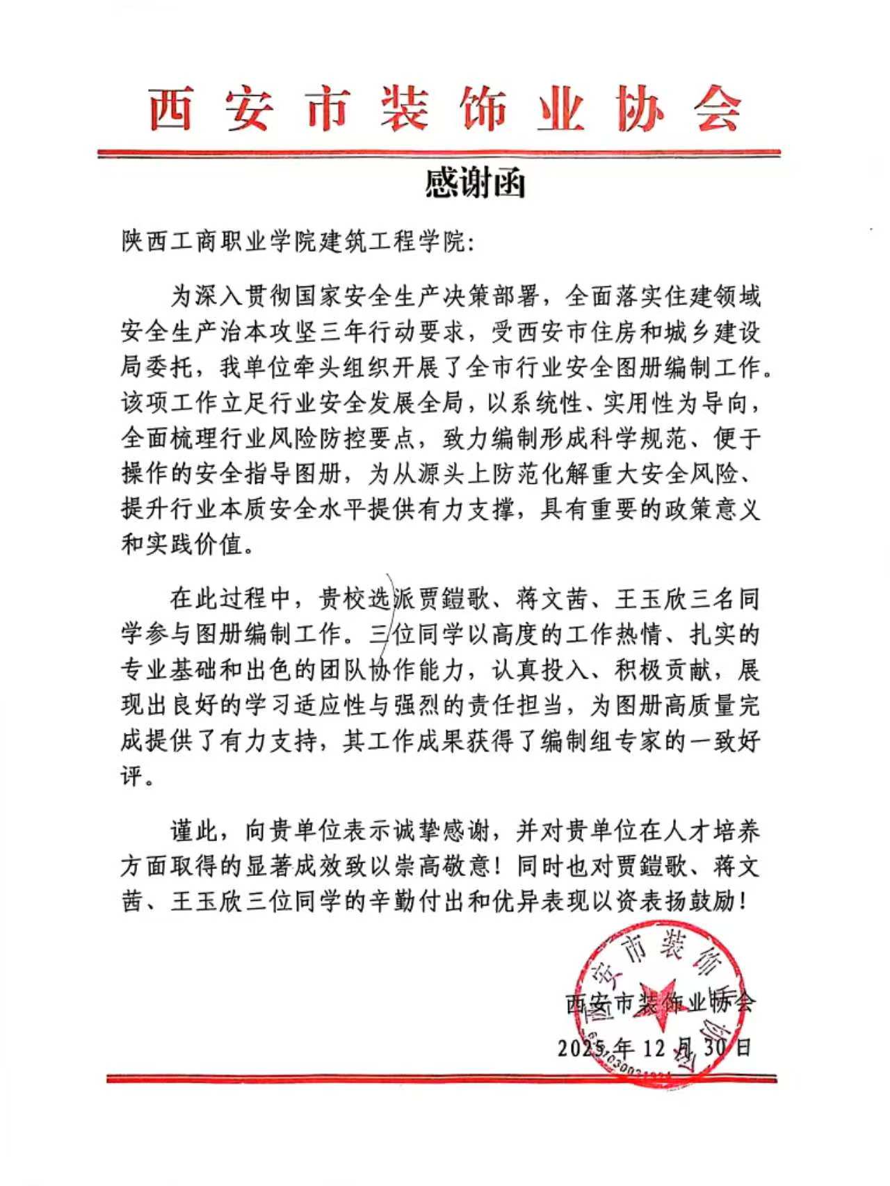 近日,建筑工程学院收到来自西安市装饰业协会发来的感谢信,对学院在全市行业安全图册编制工作中给予的支持,以及学院师生展现出的专业素养和敬业精神表示感谢,对在图册编制工作中表现积极的几名同学给予表扬肯定。