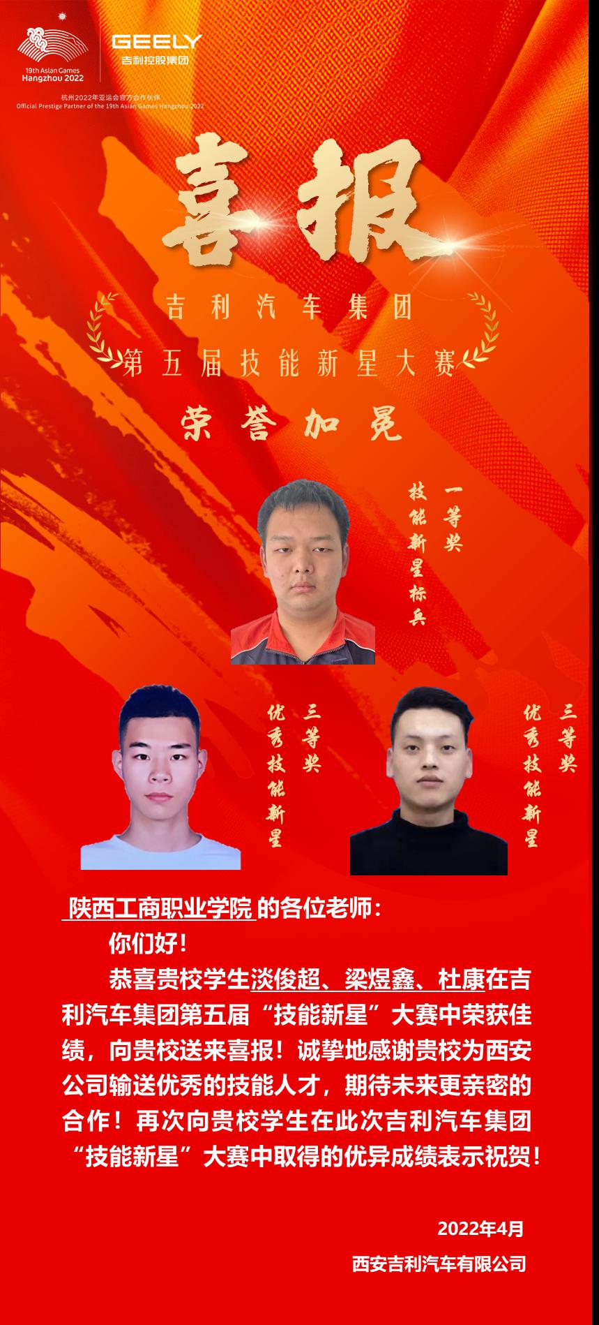 赛后,吉利汽车集团、西安吉利汽车有限公司向学校发来喜报及贺信,感谢学校输送的优秀技能人才。学校将持续坚持“以职业为根本,以质量求生存,以特色树品牌,以创新促发展”的办学理念,完善学校与企业“双主体”培养的职业人培养模式,为企业为社会输送更多的能工巧匠。