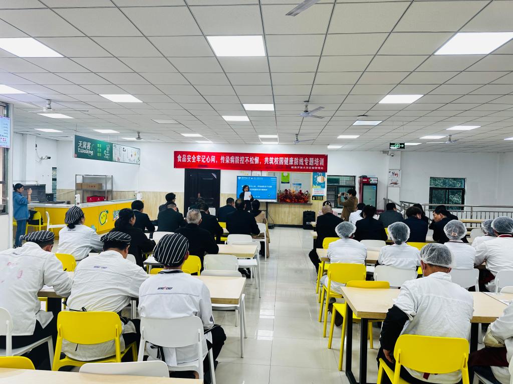 为落实陕西省教育厅等四部门关于加强全省学校食品安全与传染病防控工作会议部署,2024年11月14日下午,后勤管理处组织我校食堂从业人员进行了“食品安全牢记心间,传染病防控不松懈,共筑校园健康防线”专题培训。副校长杜京、后勤管理处处长张宏涛、副处长郝红梅、严鹤峰参加了培训会。
