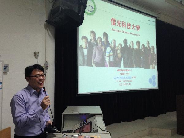 当日晚,傅秀仁博士在阶梯教室为我校学生进行了专题宣讲,他重点介绍了侨光科技大学的办学情况、学习费用、学习时间和住宿等情况,同学们积极参与,互动良好,宣讲会在融洽的气氛中结束。